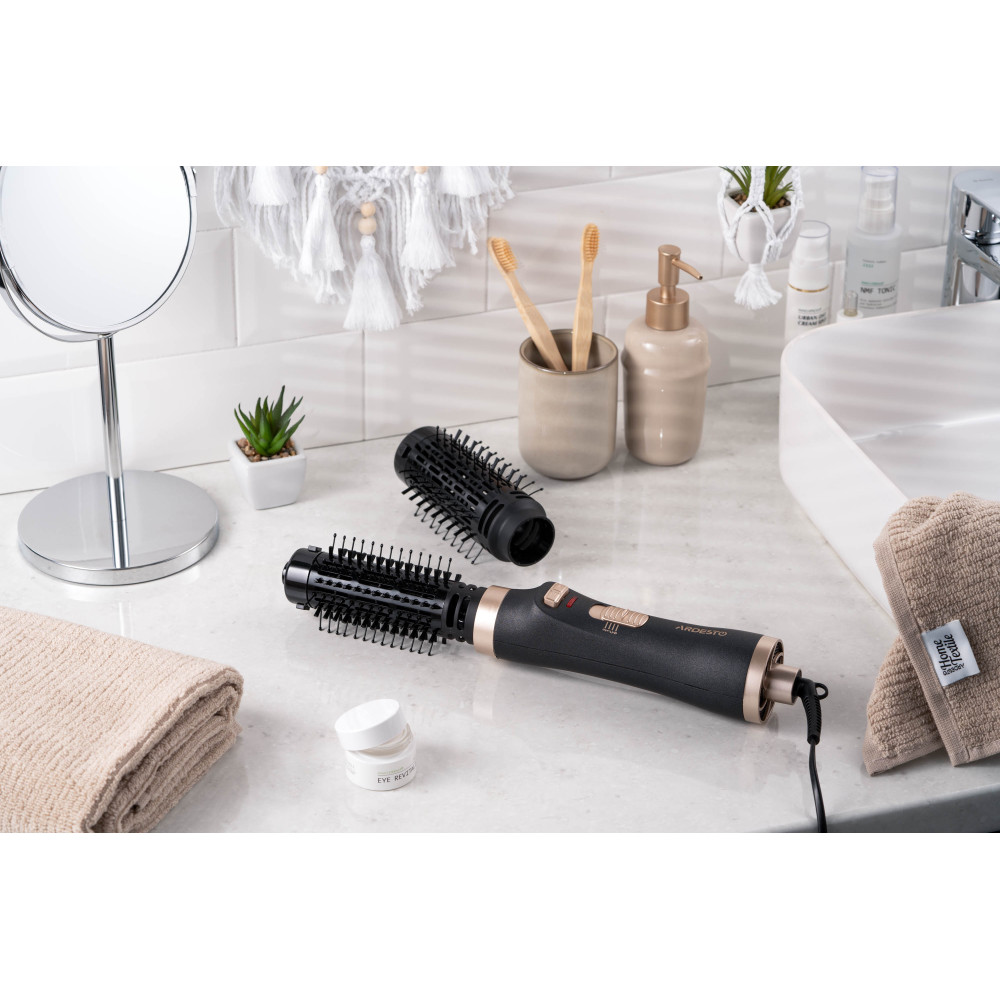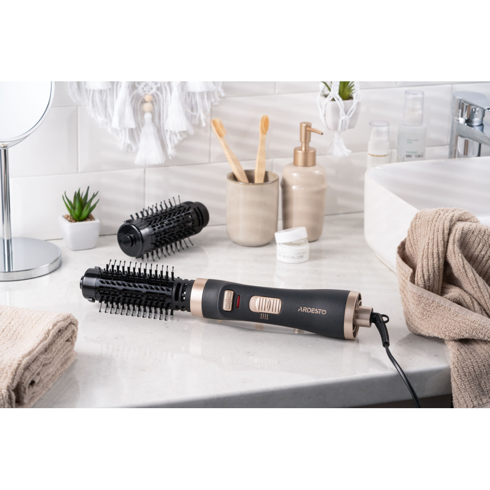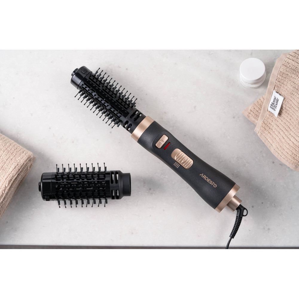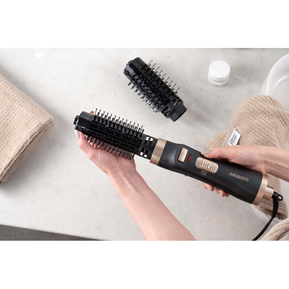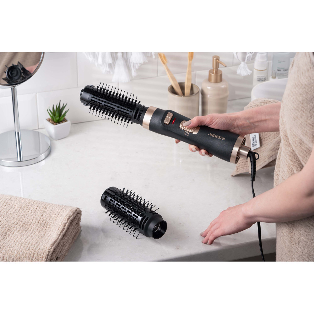Фен-щетка ARDESTO – стайлер для укладки локонов, одновременно сушащий волосы, мощностью 1 000 Вт. Устройство имеет два температурных режима. В комплектации предусмотрены две съемные насадки с керамическим покрытием диаметром 40 и 50 мм, вращающиеся по и против часовой стрелки. Доступна функция Cool Shot, холодный обдув. Добавляет удобство при использовании шнура питания с вращением на 360°. Чтобы стать обладательницей красивой укладки, не обязательно посещать салон. С феном-щеткой ARDESTO HD-C100 можно с легкостью делать прическу самостоятельно.