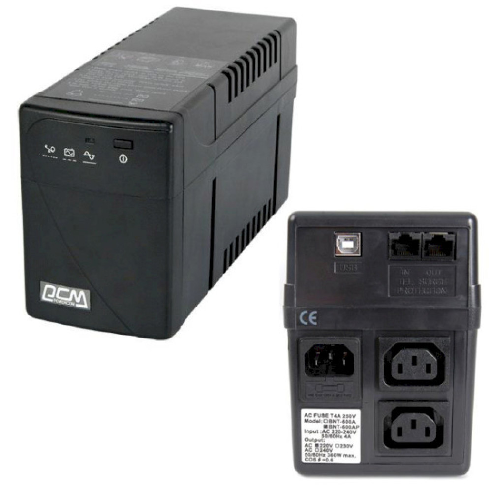 Powercom BNT-800 AP (BNT-800 AP USB) - компактный источник бесперебойного питания, который предназначен для защиты персональных компьютеров и небольших рабочих станций от основных неполадок с электропитанием.