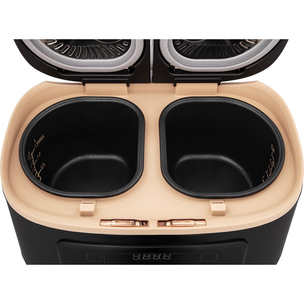 Мультиварка с двумя чашами объемом 1,5 л. с антипригарным покрытием и технологией TwinChef, позволяющей одновременно готовить от 2 до 4 блюд. Чаши имеют отдельные ТЭНы, не соприкасаются друг с другом и для каждой можно выбрать индивидуальные настройки приготовления. Возможность готовить 2 разных блюда одновременно или, используя контейнеры для приготовления на пару - до четырёх блюд. Антипригарное покрытие чаш - Daikin.