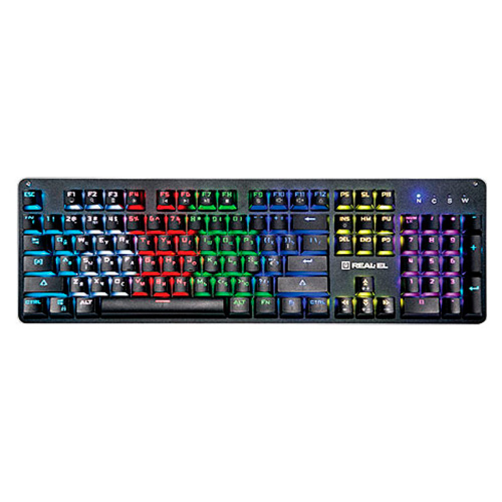 Особливості механічної ігрової клавіатури REAL-EL M47 RGB: металева основа, програмовані режими підсвічування, підсвічування всіх символів з додатковими світловими ефектами, надійні механічні перемикачі (BLUE SWITCH), 12 Fn кнопок швидкого доступу до Windows, Інтернету і Мультимедіа.