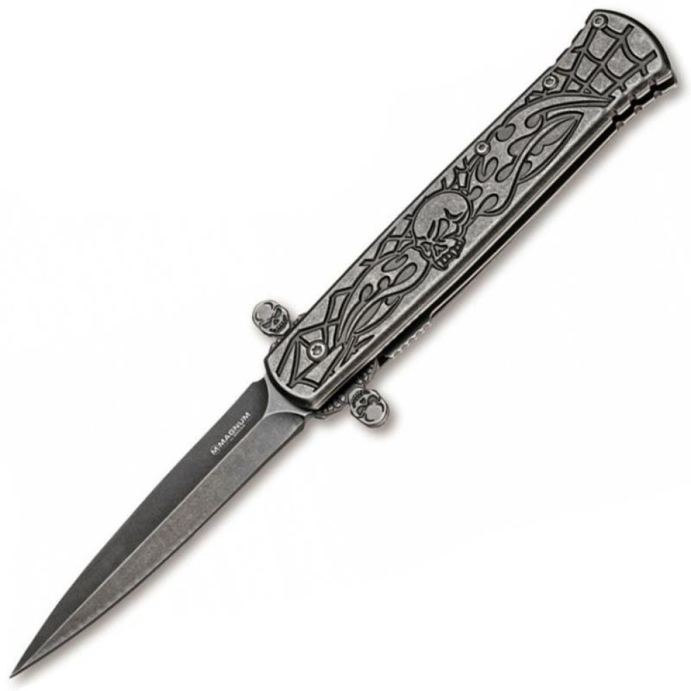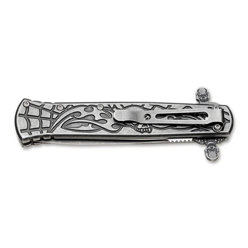 Конструкційно ж це класичний ніж в стилі Boker Magnum з хорошою сталлю 440А, металевими накладками, надійним замком типу Liner Lock. Подвійний фліппер з гравіюванням у формі черепа не тільки полегшує викид клинка, але служить захистом від зісковзування долоні.