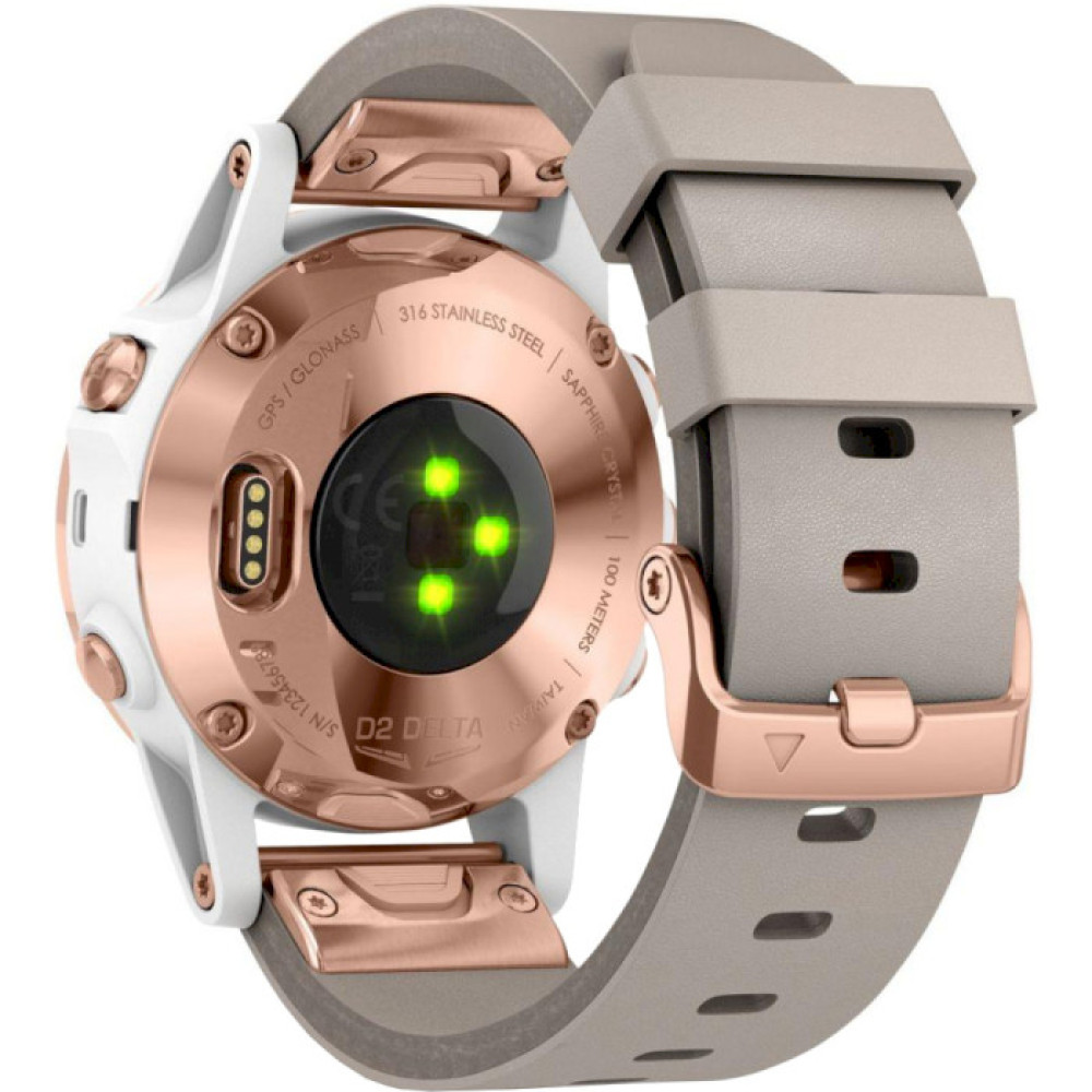 На тильній стороні розумного годинника Garmin D2 розташована контактна площадка з декількома контактами, і високоточний оптичний датчик. Контактна площадка служить для заряду незнімної акумуляторної батареї, і цей майданчик сумісний тільки з оригінальним зарядним пристроєм (кредл), яким комплектується ця модельна лінійка годин. Оптичний датчик забезпечує роботу пульсометра, і бере участь у загальному моніторингу фізичної діяльності.